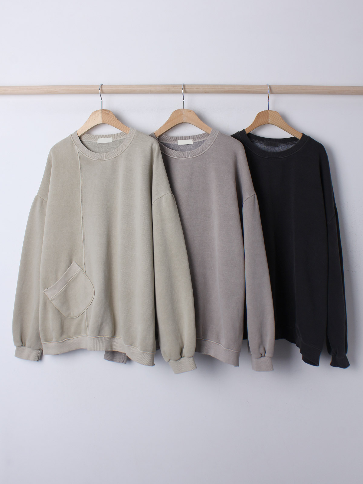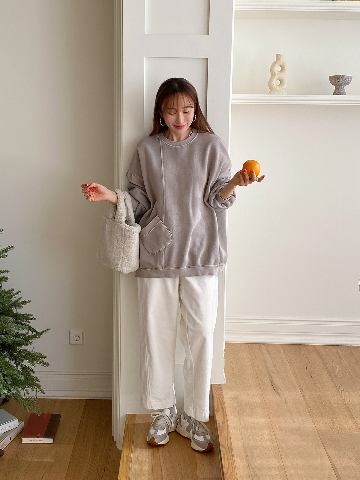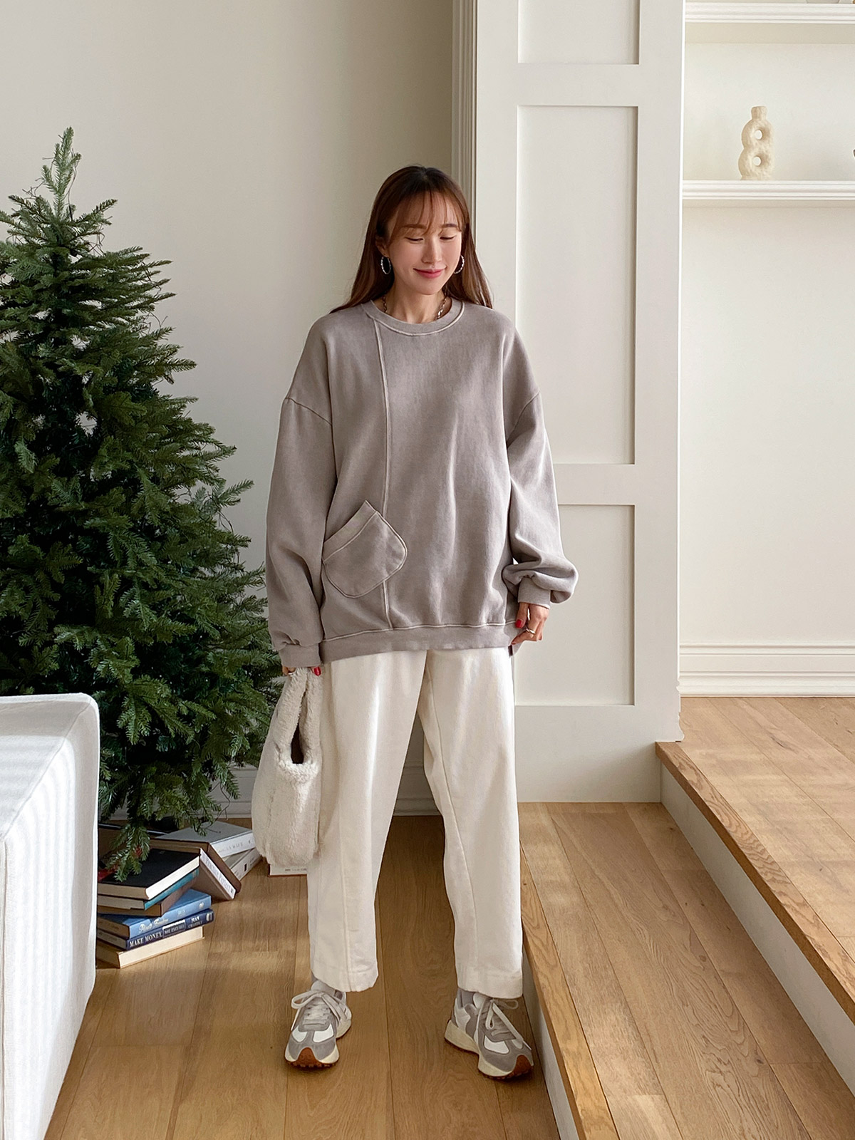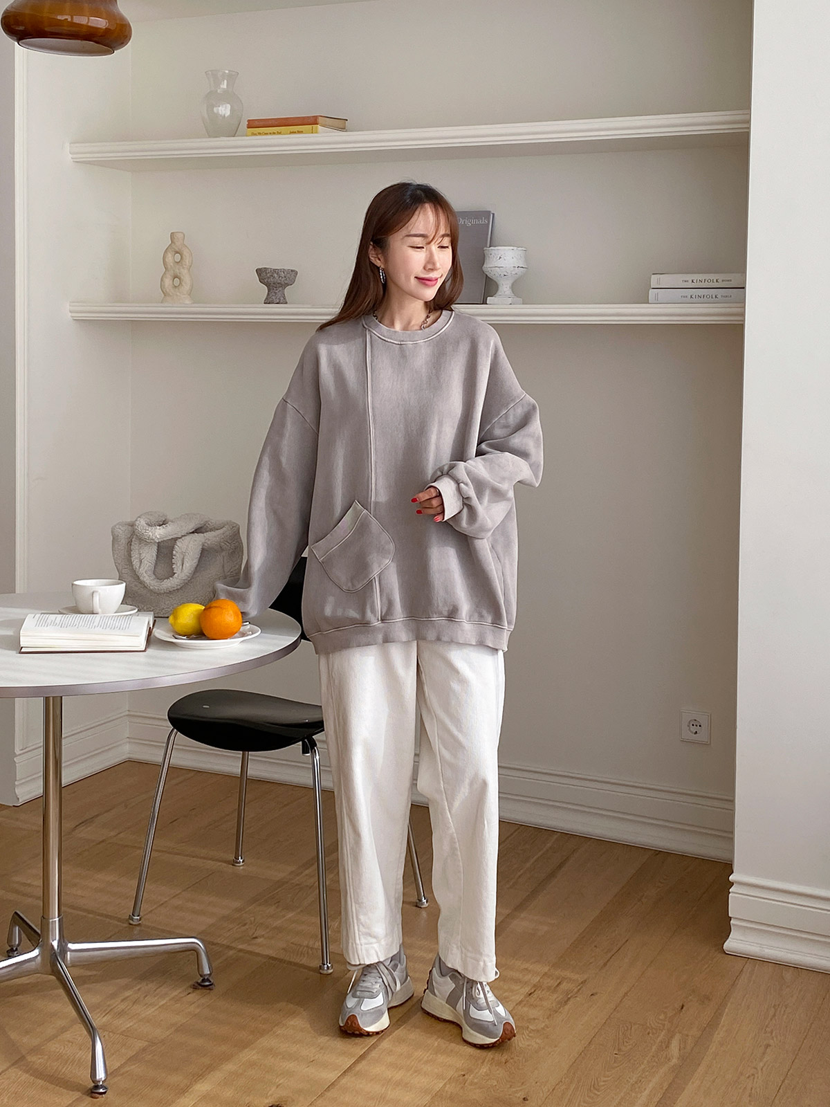 포켓 포인트와 절대 디자인 포인트가 들어가 밋밋하지 않고 피그워싱으로 빈티지한 무드 연출이 가능한 오버핏 기모 맨투맨